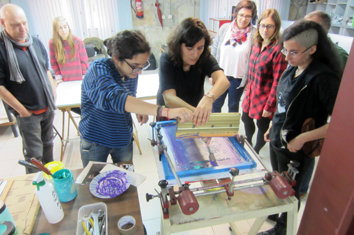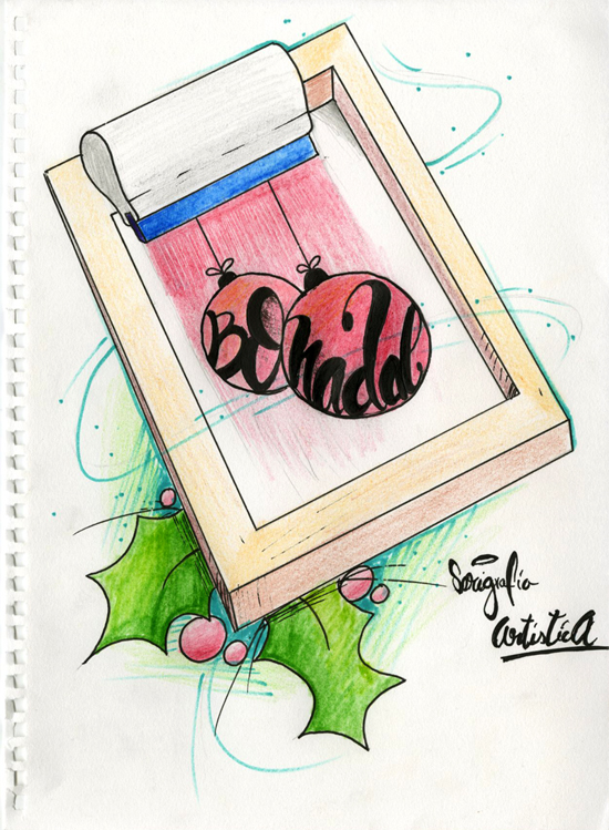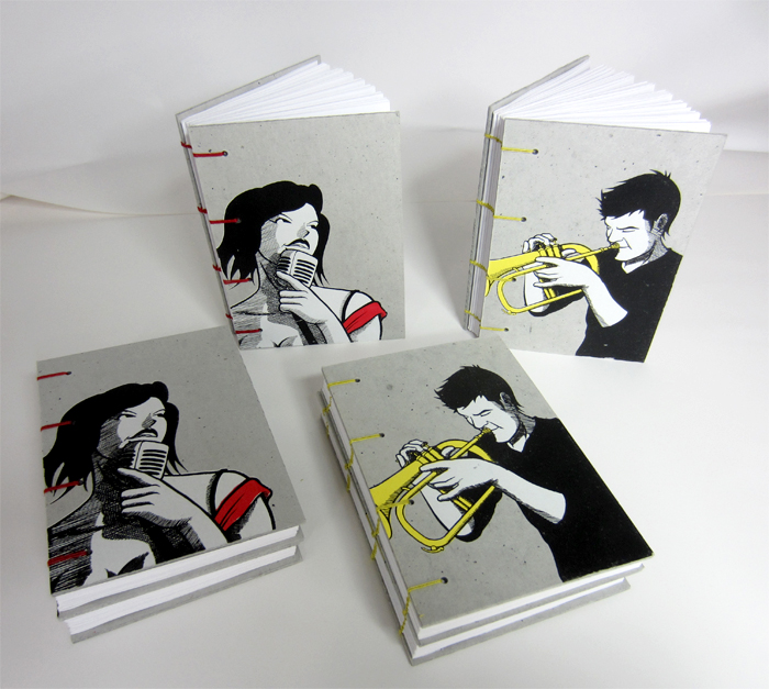 Colaboración entre David , alumno do Nivel superior de Serigrafía , e Antonio, ex-alumno de Encadernación da Emao : Debuxos orixinais e serigrafiado : Encuadernación :