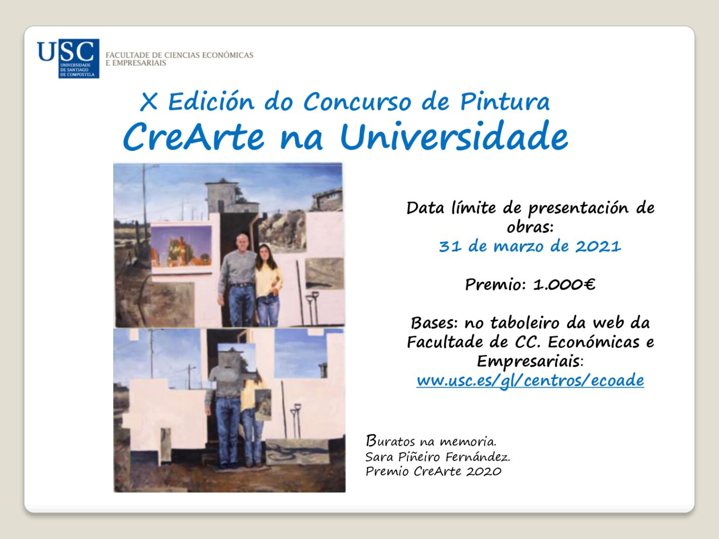 O Decanato da Facultade de Ciencias Económicas e Empresariais da Universidade de Santiago de Compostela infórmanos da convocatoria da X Edición do Concurso de pintura: “CreArte na Universidade” A Facultade …