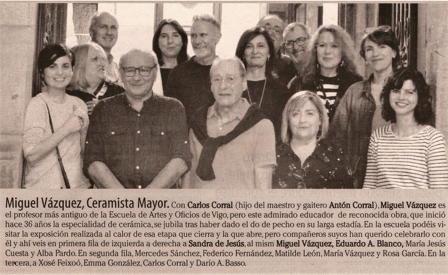 Fernando Franco na súa sección Mira Vigo no Faro de Vigo, publica unha reseña sobre o noso mestre de cerámica Miguel Vázquez, recentemente xubilado. Nesta foto, na porta da Escola, …