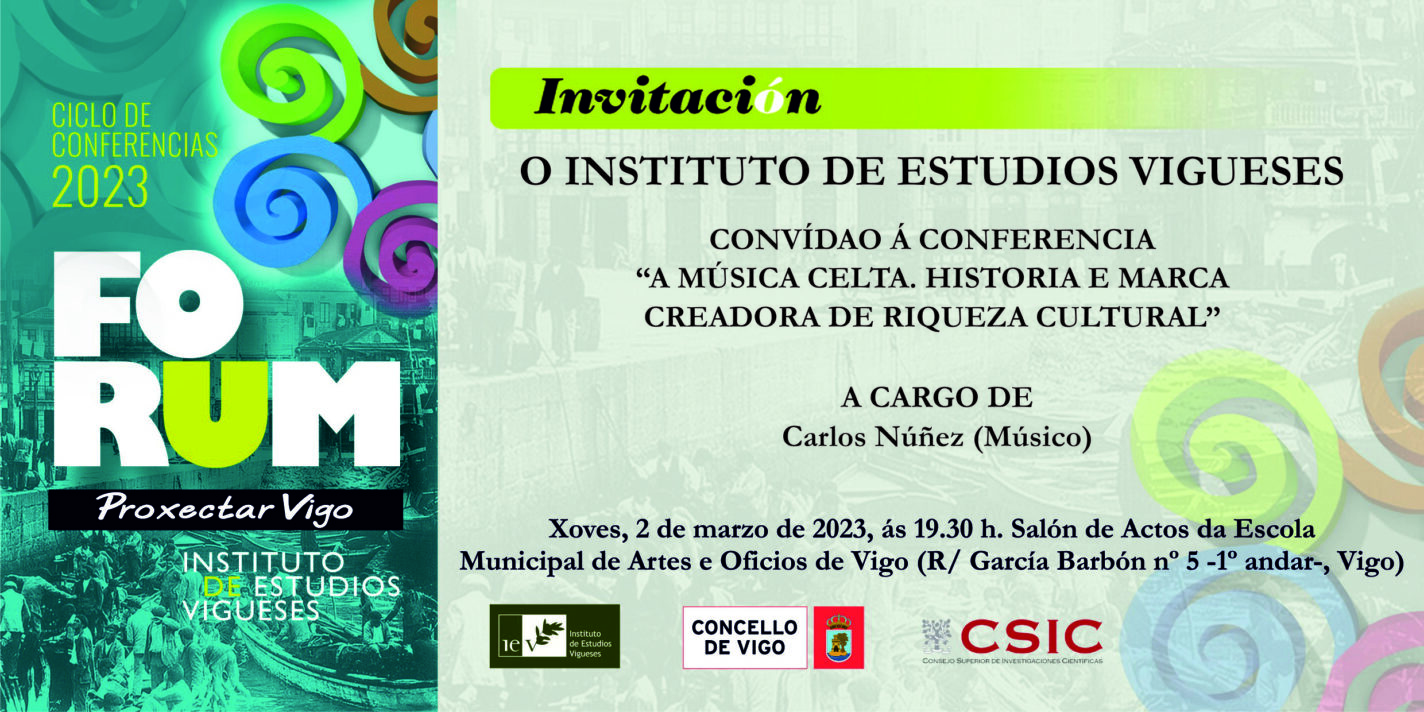 Conferencia “A Música Celta. Historia e Marca Creadora de Riqueza Cultural” por Carlos Núñez [OUTRAS NOVAS] Marzo 2, 2023 Xoves 2 de marzo ás 19:30 no Salón de Actos 1ª andar (Rúa Pontevedra, nº 1. Vigo) Entrada Libre ata completar aforo.