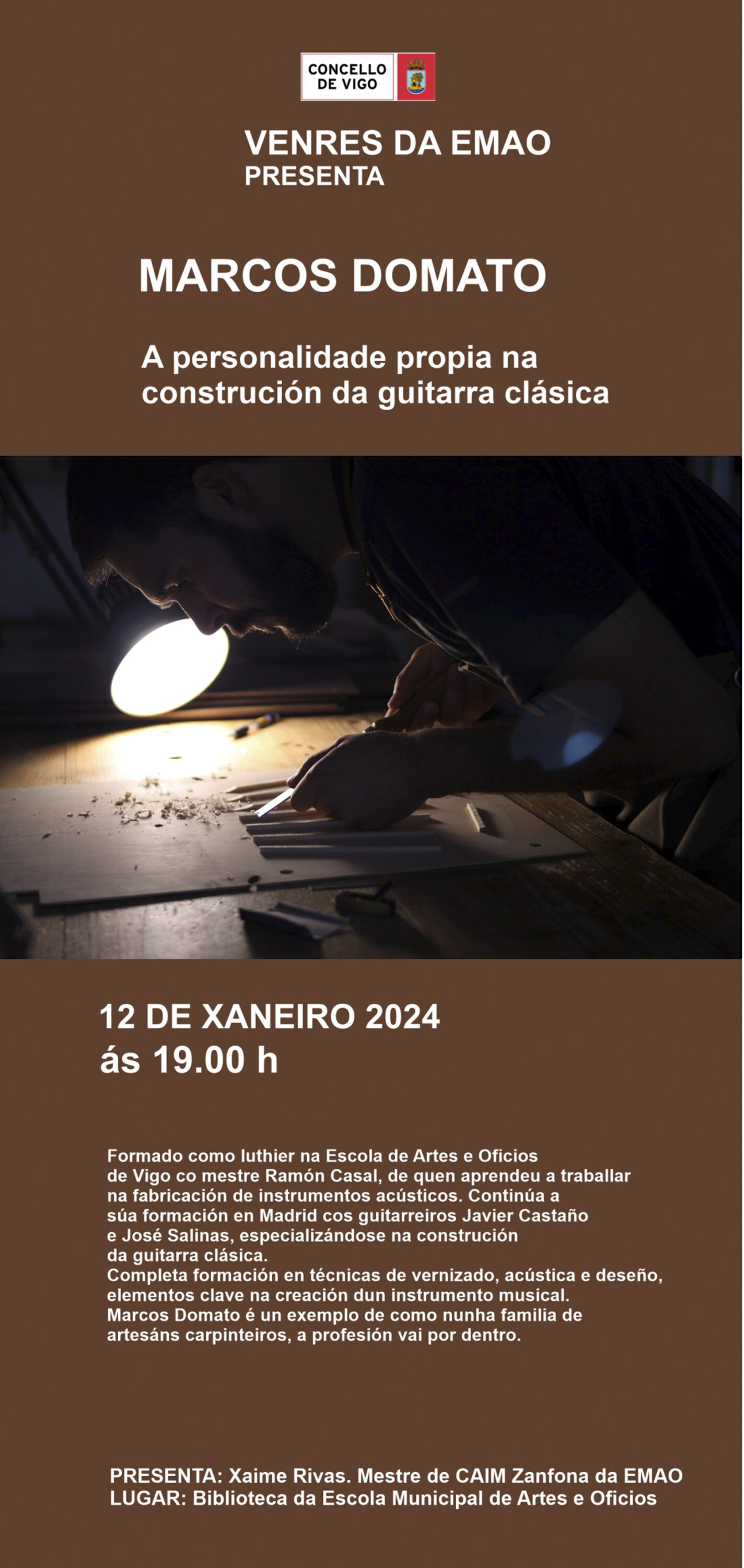 Marcos Domato formouse como luthier na Escola de Artes e Oficios de Vigo co mestre Ramón Casal, de quen aprendeu a traballar na fabricación de instrumentos acústicos. Ampliou a súa …