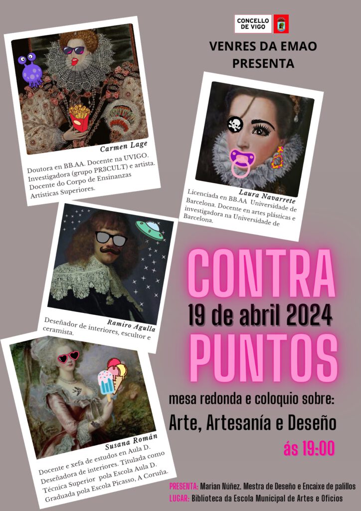 Mesa redonda e coloquio sobre arte, artesanía e deseño, coa participación de Carmen Lage (doutora en Belas Artes, docente na Universidade de Vigo, Investigadora -Grupo PR3CULT- e artista, docente do Corpo de Ensinanzas Artísticas Superiores), Laura Navarrete (licenciada en Belas Artes pola Universidade de Barcelona, docente en artes plásticas e investigadora da Universidade de Barcelona), Ramiro Agulla (deseñador de interiores, escultor e ceramista) e Susana Román (docente e xefa de estudos en Aula D, deseñadora de interiores, técnica superior pola Escola Aula D e graduada pola Escola Picasso da Coruña).