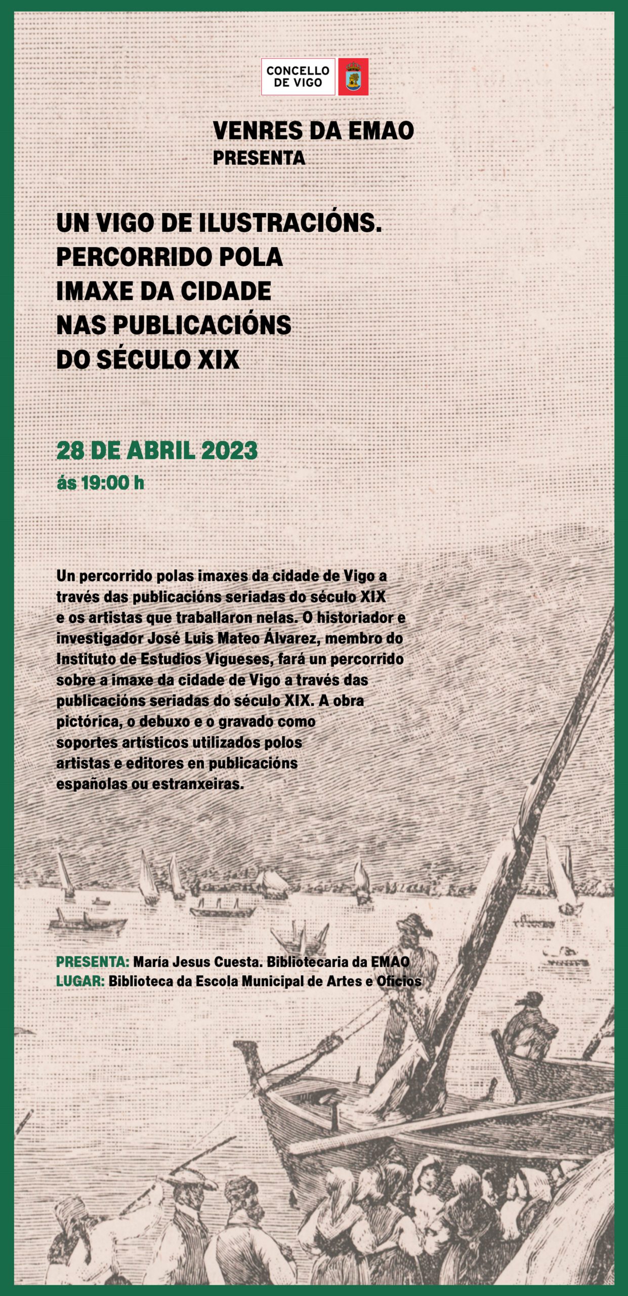 O historiador e investigador José Luis Mateo Álvarez, membro do Instituto de Estudios Vigueses fará un percorrido sobre a imaxe da cidade de Vigo a través das publicacións seriadas do século XIX. A obra pictórica, o debuxo e o gravado como soportes artísticos utilizados polos artistas e editores en publicacións españolas ou estranxeiras.