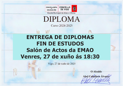 Hoxe, venres 27 de xuño de 2025, ás 18:30h, terá lugar o acto de entrega de Diplomas ao alumnado que remata nivel na Escola Municipal de Artes e Oficios (EMAO). O acto …