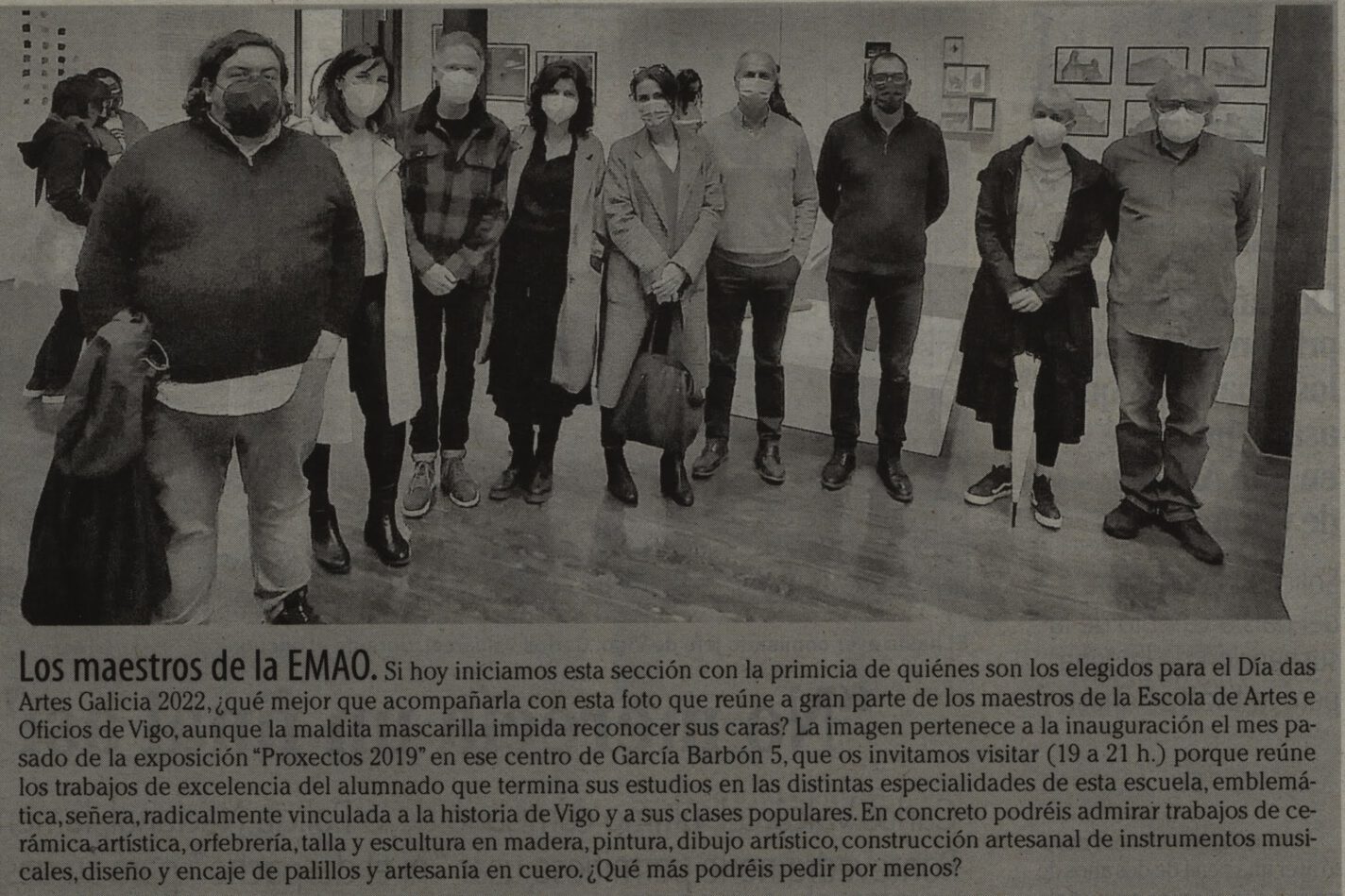 Publicado no Faro de Vigo Grazas a Fernando Franco pola referencia á nosa exposición Proxectos 2019 que fai na súa sección “Mira Vigo” Lugar: Espazo EMAO. Sala de exposicións da …