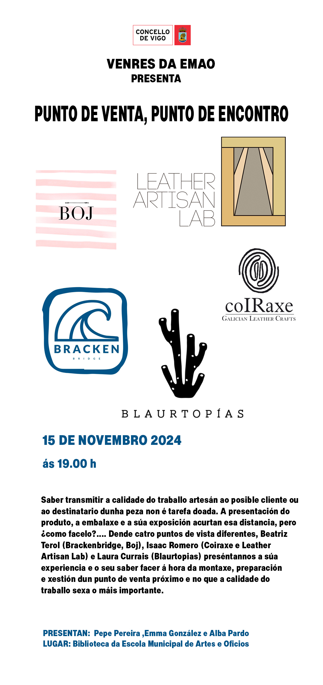 15-11-2024. Venres da EMAO presenta “Punto de venta, punto de encontro” [ARTESANÍA EN COIRO, MODA E CONFECCIÓN E SERIGRAFÍA ARTÍSTICA]