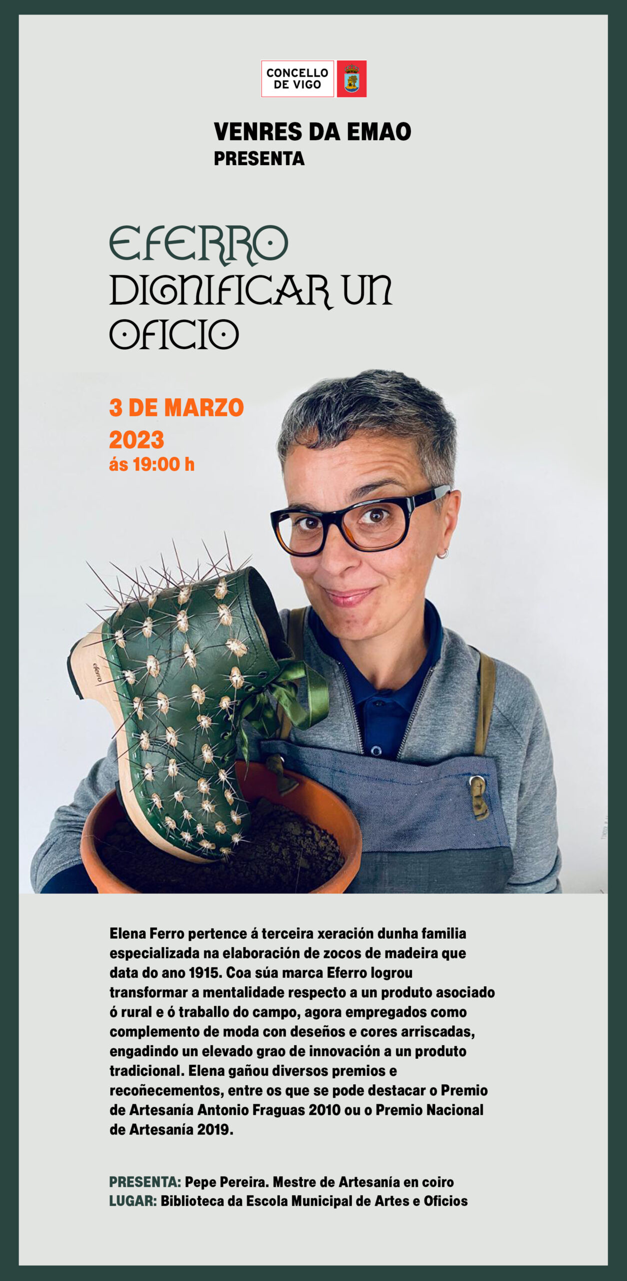 Elena Ferro petence á terceira xeración dunha familia especializada na elaboración de zocos de madeira que data do ano 1915. Coa súa marca Eferro logrou transformar a mentalidade respecto a un producto asociado ó rural e ó traballo do campo, agora empregados como complemento de moda con deseños e cores arriscadas, engadindo un elevado grao de innovación a un produto tradicional.