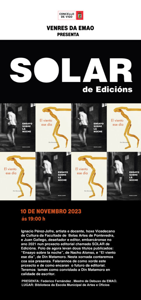 Ignacio Pérez-Jofre, artista e docente, hoxe Vicedecano de Cultura da Facultade de Belas Artes de Pontevedra, e Juan Gallego, deseñador e editor, embarcáronse no ano 2021 nun proxecto editorial chamado SOLAR de Edicións. Polo de agora levan dous títulos publicados: “Ensayo sobre la noche”, de Nacho Alonso, e “El viento ese día”, de Din Matamoro. Nesta xornada contaremos coa súa presenza. Falarannos de como xorde este proxecto e de como encaran o futuro da editorial. Teremos tamén como convidado a Din Matamoro en calidade de escritor.