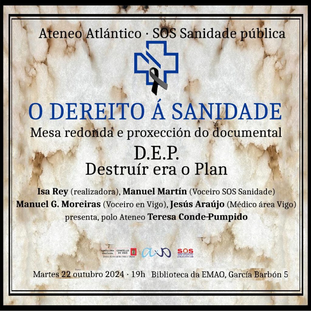 Mesa redonda arredor do deterioro da sanidade pública en Galicia e proxección do documental “DEP Destruír era o plan. Martes 22 de outubro, na EMAO, a partir das 19.30. Organiza o Ateneo Atlántico.