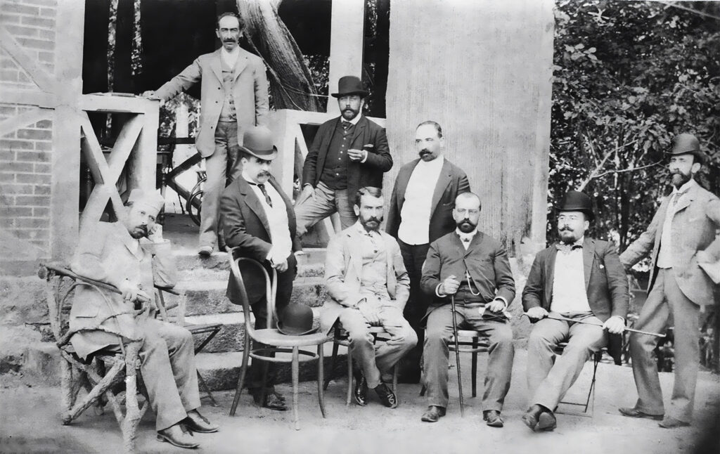 Isaac Peral, no centro, sentado xunto a outros residentes do Balneario de Mondariz