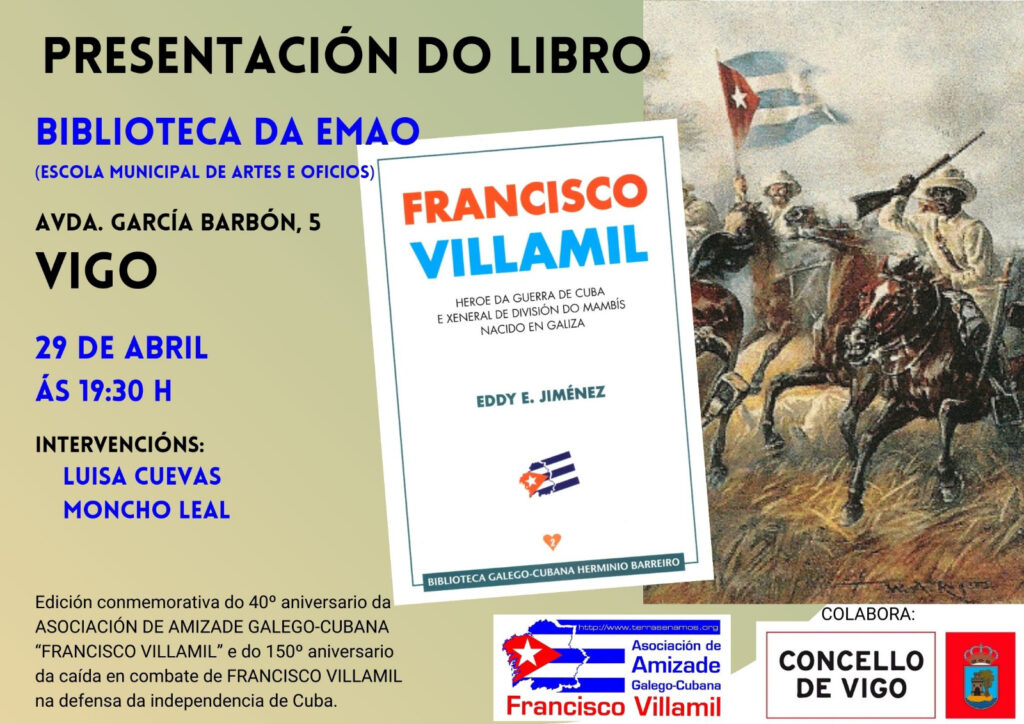 Este luns 29 de abril terá lugar a presentación do libro de Eddy E. Jiménez sobre Francisco Villamil, heroe da guerra de Cuba con orixes galegas. Trátase da edición conmemorativa do 40º aniversario da Asociación Amizadegalego-cubana “Francisco Villamil”.