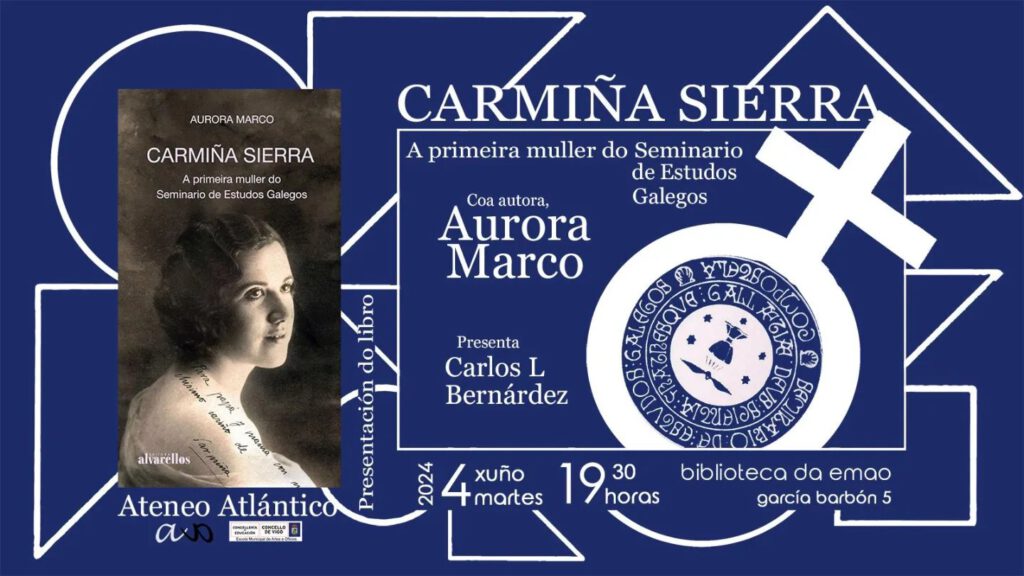 O Ateneo Atlántico presenta o libro “Carmiña Sierra, A primeira muller do Seminario de Estudos Galegos”, na biblioteca da EMAO. No acto participarán a autora, Aurora Marco, e Carlos L. Bernárdez como presentador.