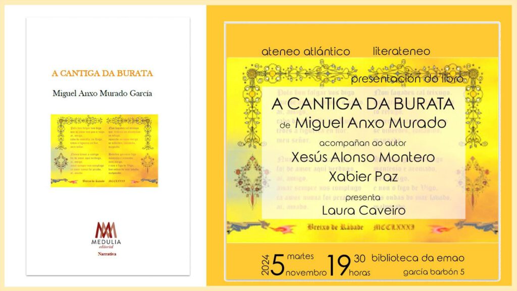 Presentación do último libro de Miguel Anxo Murado que leva por título A cantiga da Burata. No acto, o autor conversará con Xabier Paz e Xesús Alonso Montero; a presentación correrá a cargo de Laura Caveiro.