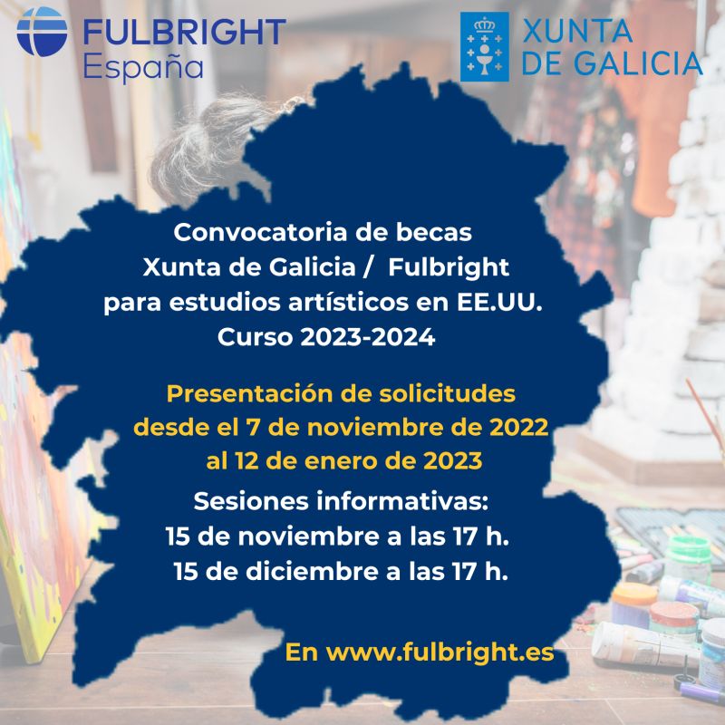 A Consellería de Cultura, Educación, Formación Profesional e Universidades da Xunta de Galicia e a Comisión de Intercambio Cultural, Educativo e Científico entre España e os Estados Unidos de América convocan 5 bolsas para a ampliación de estudos artísticos nos Estados Unidos en calquera especialidade ou área de actividade artísticas, incluídas pero non limitadas a: artes audiovisuais; artes escénicas; artes plásticas e visuais; música e musicoloxía; museoloxía e conservación do patrimonio; e xestión cultural.