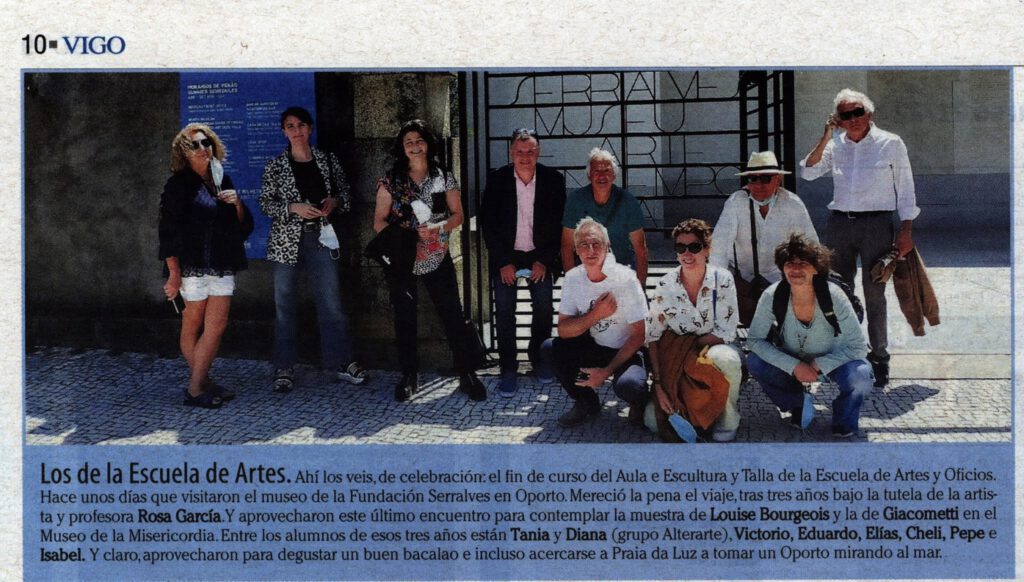Aquà tedes esta fotografÃa que publica hoxe o Faro de Vigo. A mestra de escultura e talla en madeira, Rosa GarcÃa, acompañada dun grupo de alumnos/as que este curso remataron os estudos desta especialidade, na entrada da Fundação Serralves (Porto) donde visitaron a exposición de LouiseBourgeois, tamén visitaron no Museu da Misericórdia a exposición Alberto Giacometti – Peter Lindbergh. Capturar o InvisÃvel