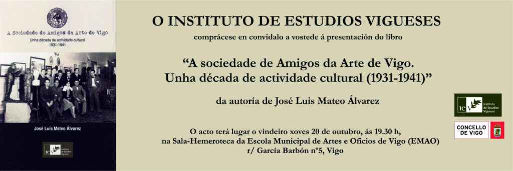 Este xoves 20 de outubro ás 19:30 presentación na hemeroteca do libro “A Sociedade de Amigos da Arte de Vigo. Unha década de actividade cultural (1931-1941)” de José Luis Mateo Álvarez, editado polo Instituto de Estudios Vigueses.