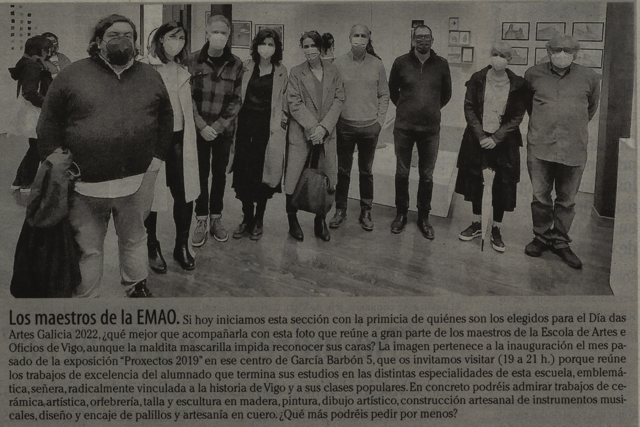 Publicado no Faro de Vigo Grazas a Fernando Franco pola referencia á nosa exposición Proxectos 2019 que fai na súa sección “Mira Vigo” Lugar: Espazo EMAO. Sala de exposicións da